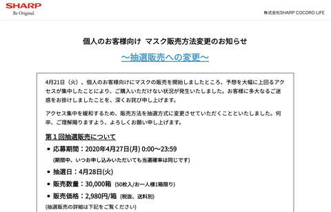 【朗報】シャープのマスク、抽選販売に。会員登録不要で