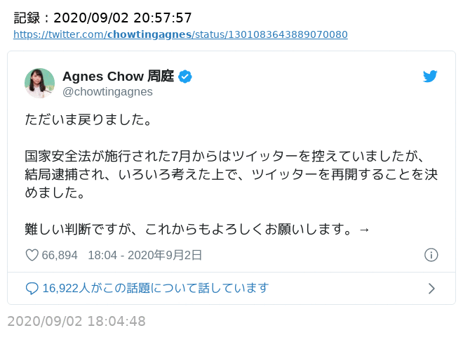 【香港】きれいなアグネスこと周庭さんツイッターを再開…意味不明に逮捕されるなどしていたため