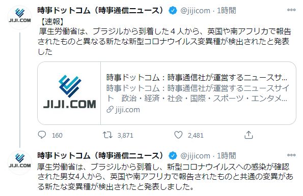 【緊急】ブラジルから到着した4人から、新たな新型コロナウイルス変異種が検出