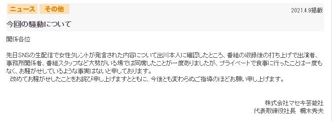 先日SNSの生配信で女性タレントが発言された内容について出川本人に確認したところ、番組の収録後の打ち上げで出演者、事務所関係者、番組スタッフなど大勢がいる場では同席したことが一度ありましたが、プライベートで食事に行ったことは一度もなく、お騒がせしているような事実はないと申しております。
