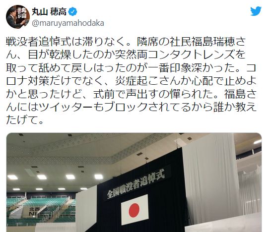 戦没者追悼式は滞りなく。隣席の社民福島瑞穂さん、目が乾燥したのか突然両コンタクトレンズを取って舐めて戻しはったのが一番印象深かった。