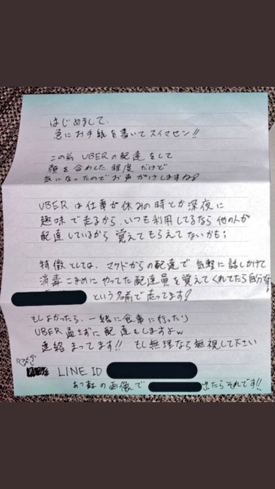 【画像】UVEREATS配達員、お客様にラブレターを送ってしまうwwwwwww