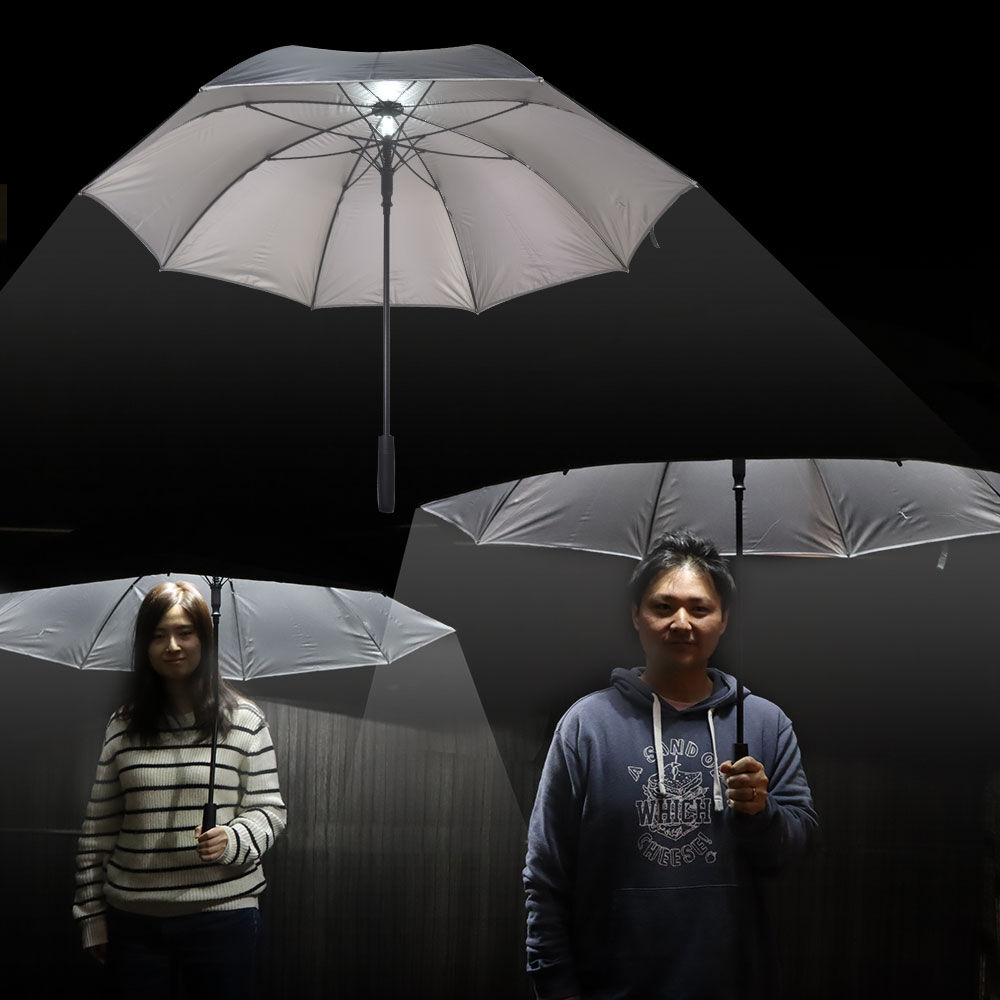 街灯を持ち歩くように周りを照らしてくれる雨の日でも安心な傘です。