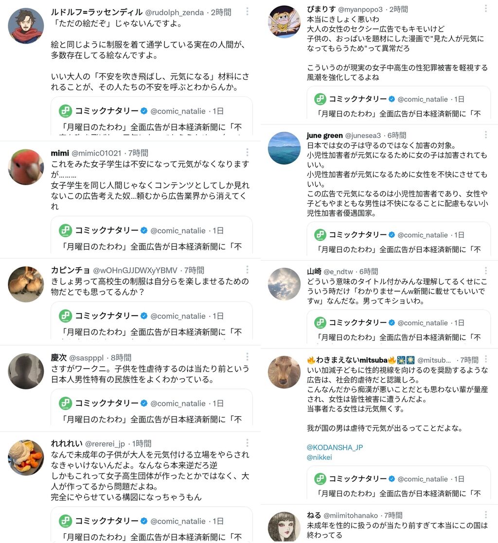 しかし、広告掲載後、ネット上からは「時代錯誤すぎる」「日経新聞なのに男にだけ元気になってもらいたいの?」「ターゲット層じゃない人が普段触れない情報が、公共的媒体により拒む人にまで届いてしまうことは十分問題」「多くの人が目にする大手新聞にこの広告はないでしょ…」「女子高生を性的に見てる漫画広告が日経新聞に出るのはどうなの?」といった批判の声が噴出する事態に。