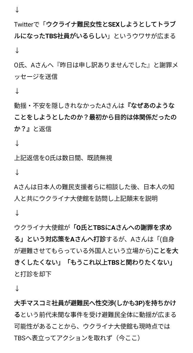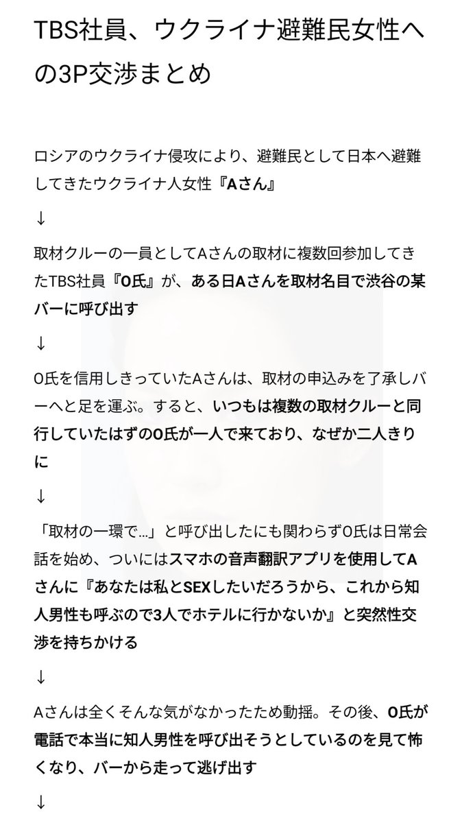 先日拡散された『TBS男性社員が、取材対象であるウクライナ人避難民女性に性交渉(しかも3P)を持ちかけた』という前代未聞のウワサですが、独自調査の結果“事実”でしたので、経緯をまとめました。