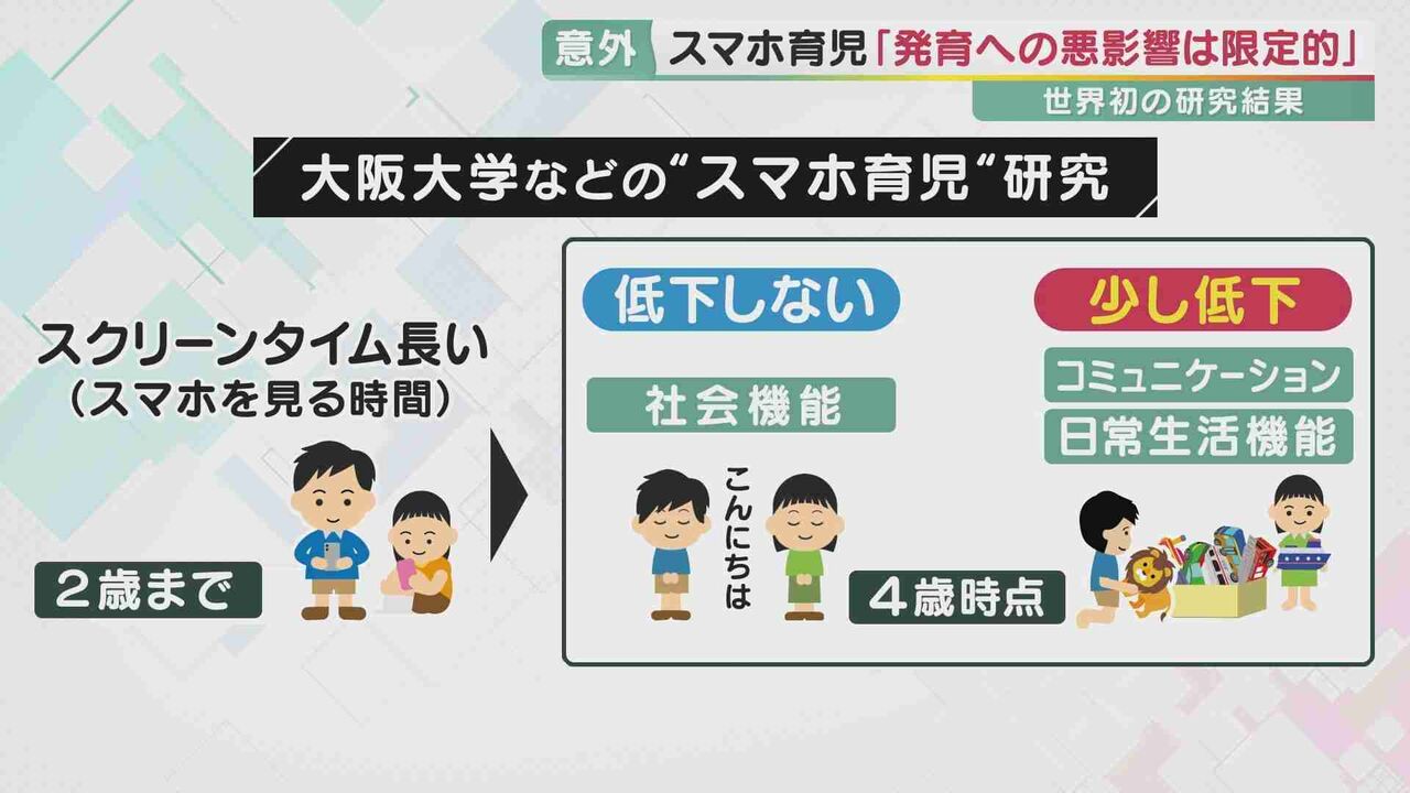2歳のスクリーンタイム(=スマホなどを見る時間)が長いと、4歳時の日常生活機能に少し悪いけど、「ごめんなさい」っていう気持ちが湧くかや挨拶できるかの「社会性」に関しては(スマホ育児は)影響が全くないことが分かりました。なんでもかんでも悪い影響が出るわけじゃない