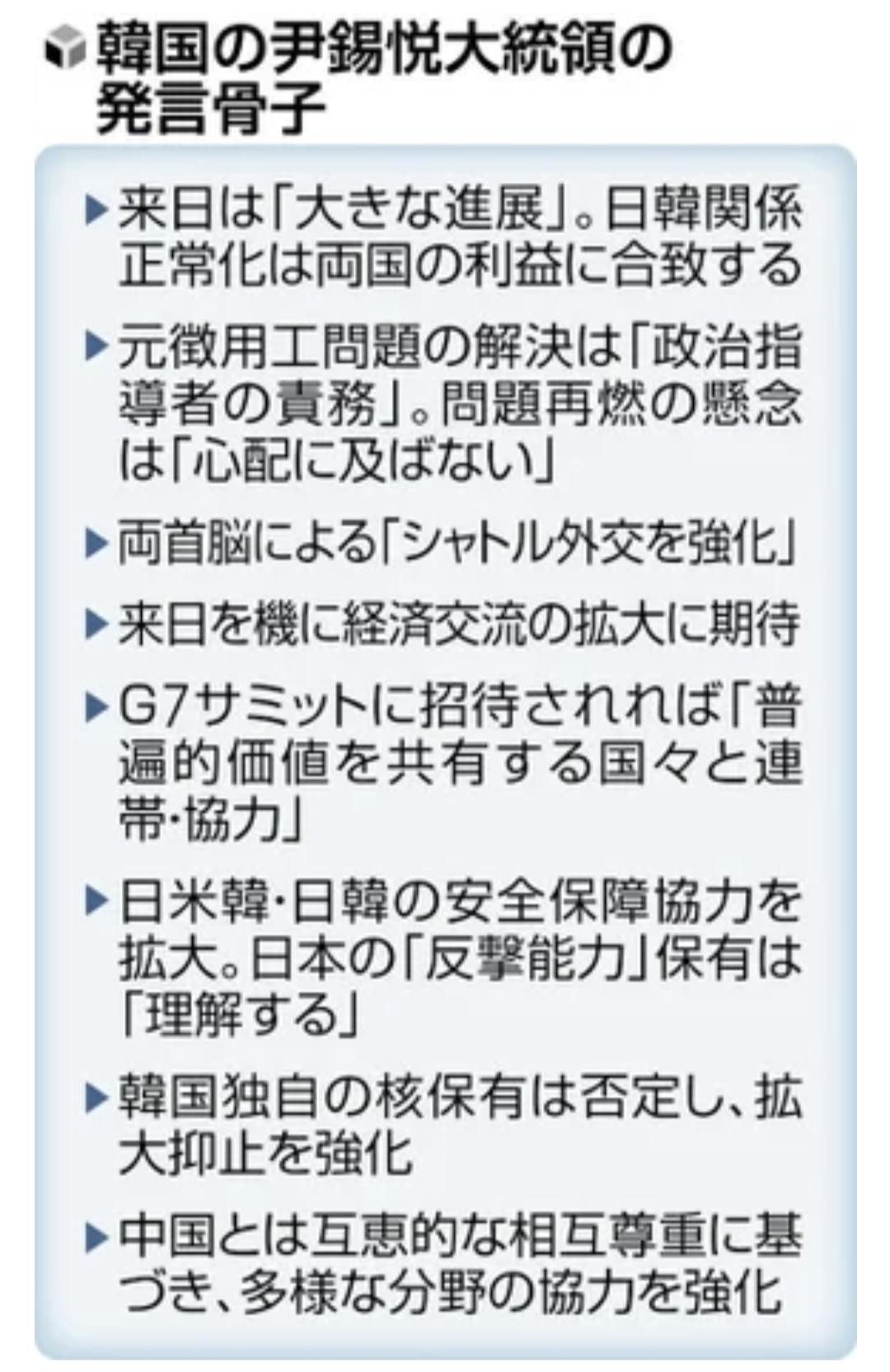 「日本はすでに数十回にわたって、我々に過去の歴史問題について、反省と謝罪を表明している」と強調。「韓日両政府は関係正常化と発展を妨げる障害物をそれぞれ自ら取り除く努力を傾けねばならない」と述べ、懸案解決に全力を挙げる考えを示した。韓国国内で、尹氏が徴用工問題などで日本に譲歩しすぎたとの批判が出ていることも意識し、関係改善の加速を目指す自らの強い意志を改めて示した形だ。