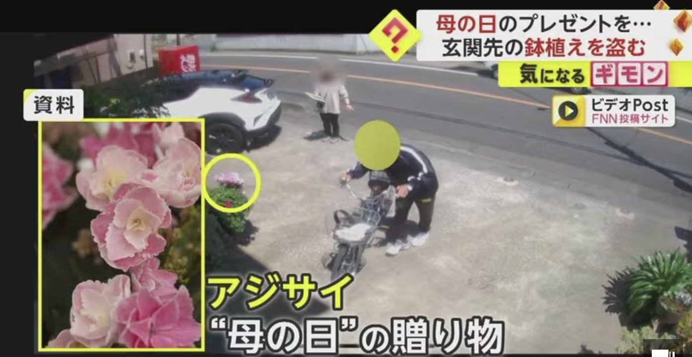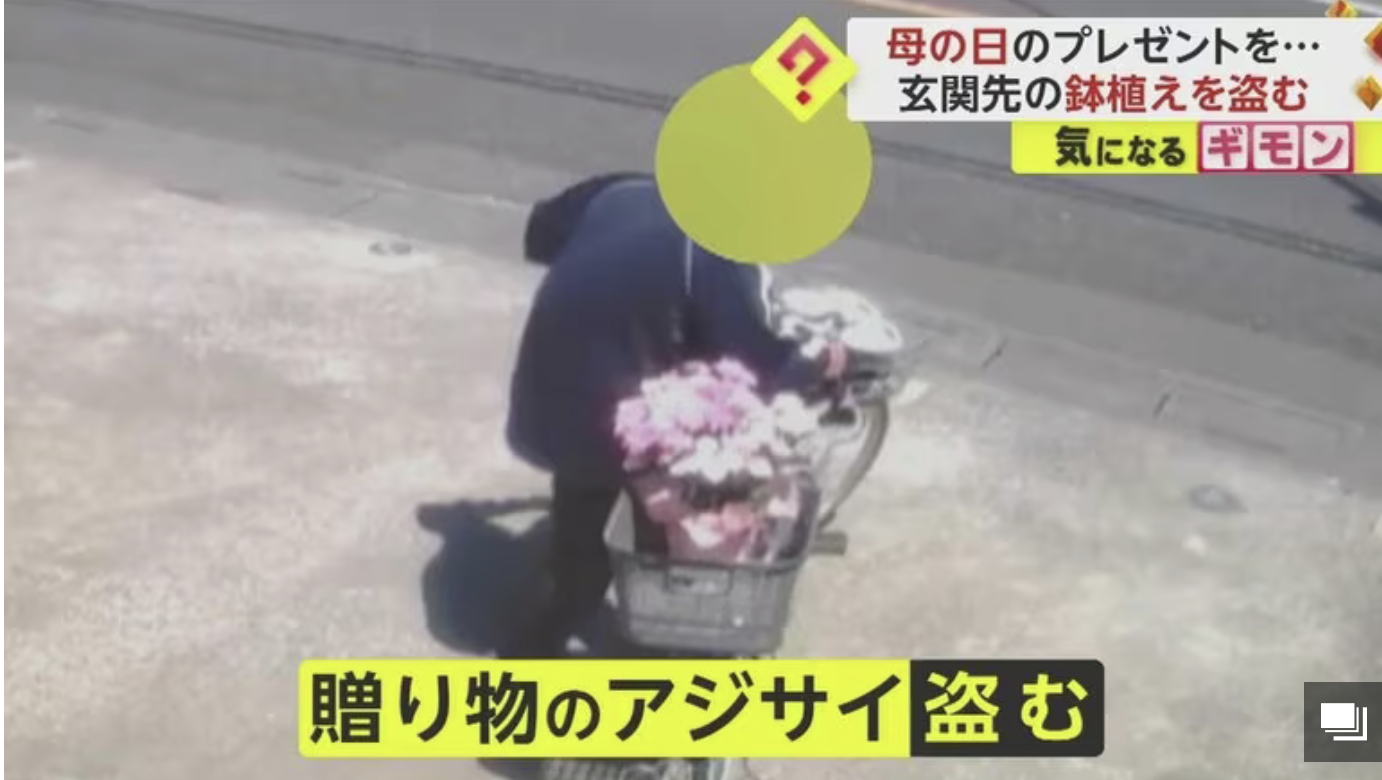 娘が母に贈ったアジサイを盗んで、自転車で走り去る高齢男性。泥棒の瞬間だ。