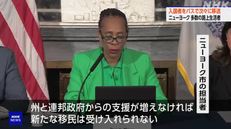 ニューヨーク市の担当者は2日、会見を開き、去年春から9万5000人以上、この1か月だけでおよそ1万4000人を受け入れたとして、「これ以上、受け入れ続けることはできない」として、州や連邦政府に財政的な支援などを求めました。