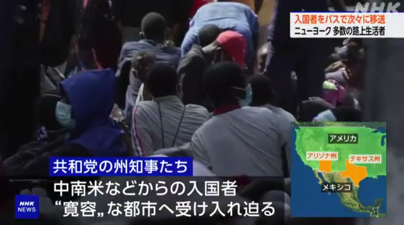 アメリカではメキシコと国境を接する南部テキサス州やアリゾナ州など、共和党の州知事たちが、バイデン政権の移民政策が寛容すぎると批判していて、中南米などから移住を目指して入国してきた人たちをバスで連日、ニューヨークなど移民に寛容とされる都市に送り込み、受け入れを迫る異例の行動をとっています。